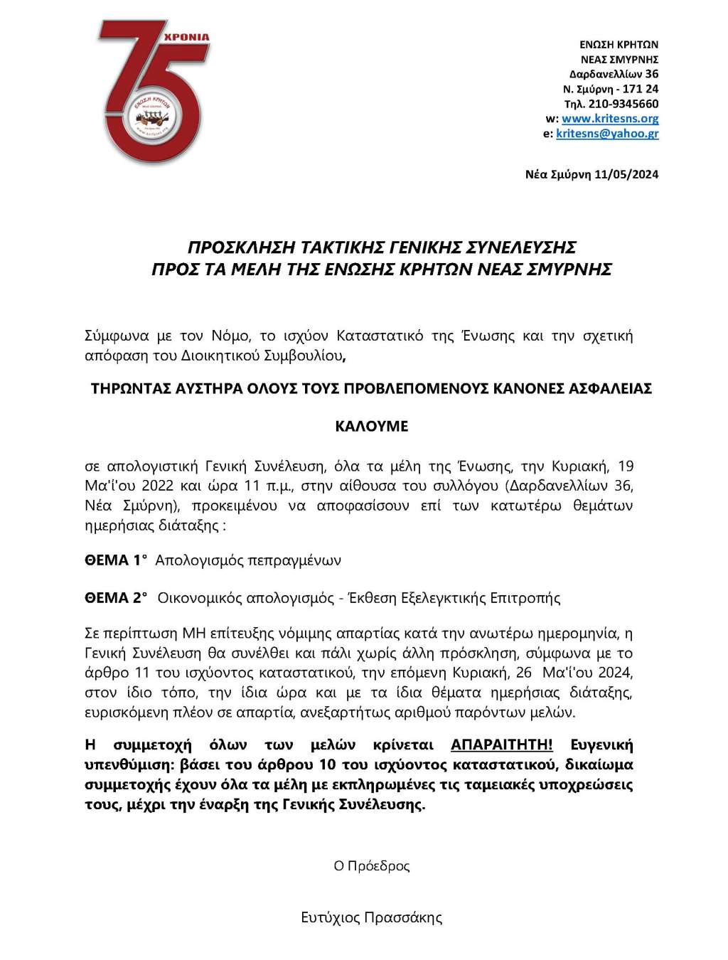 Πρόσκληση των μελών της Ένωσης Κρητών Νέας Σμύρνης σε ετήσια απολογιστική Γενική Συνέλευση
