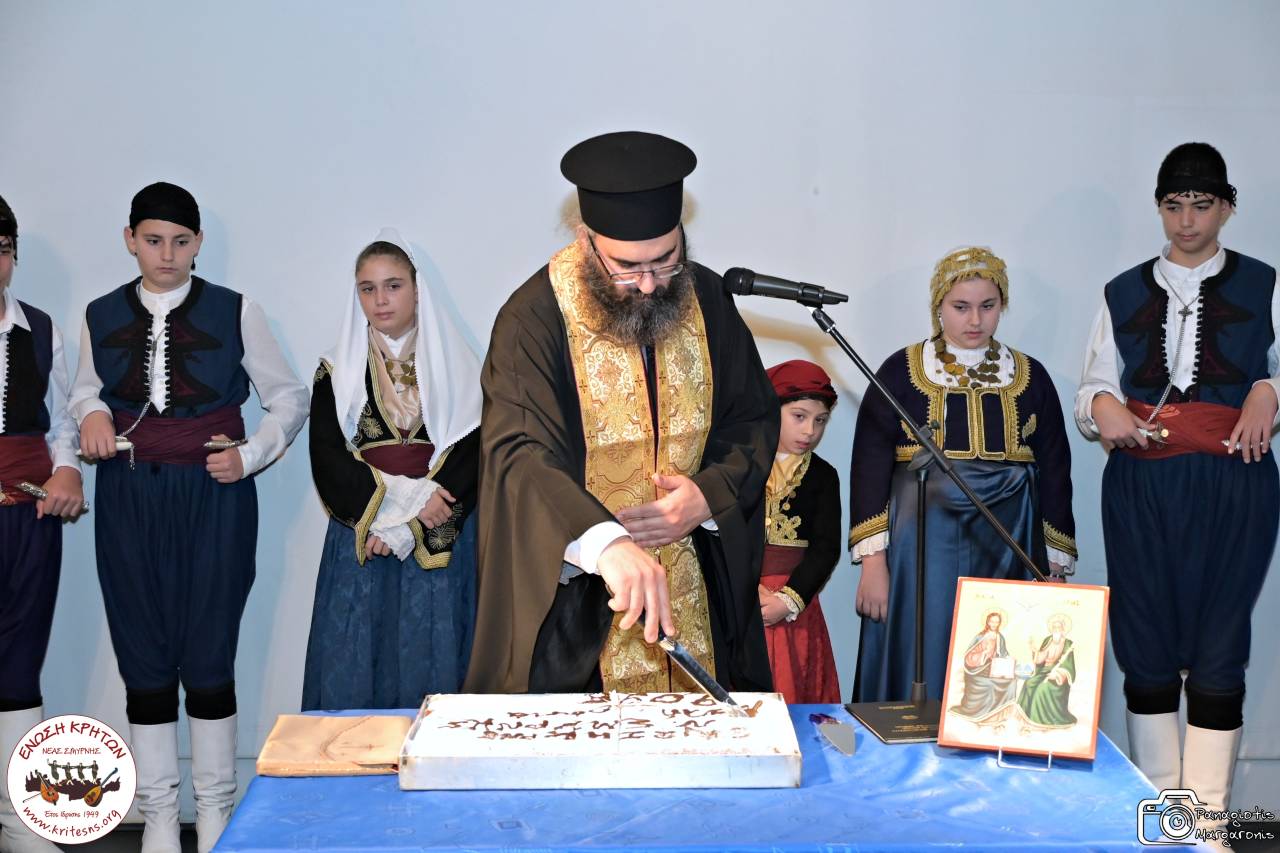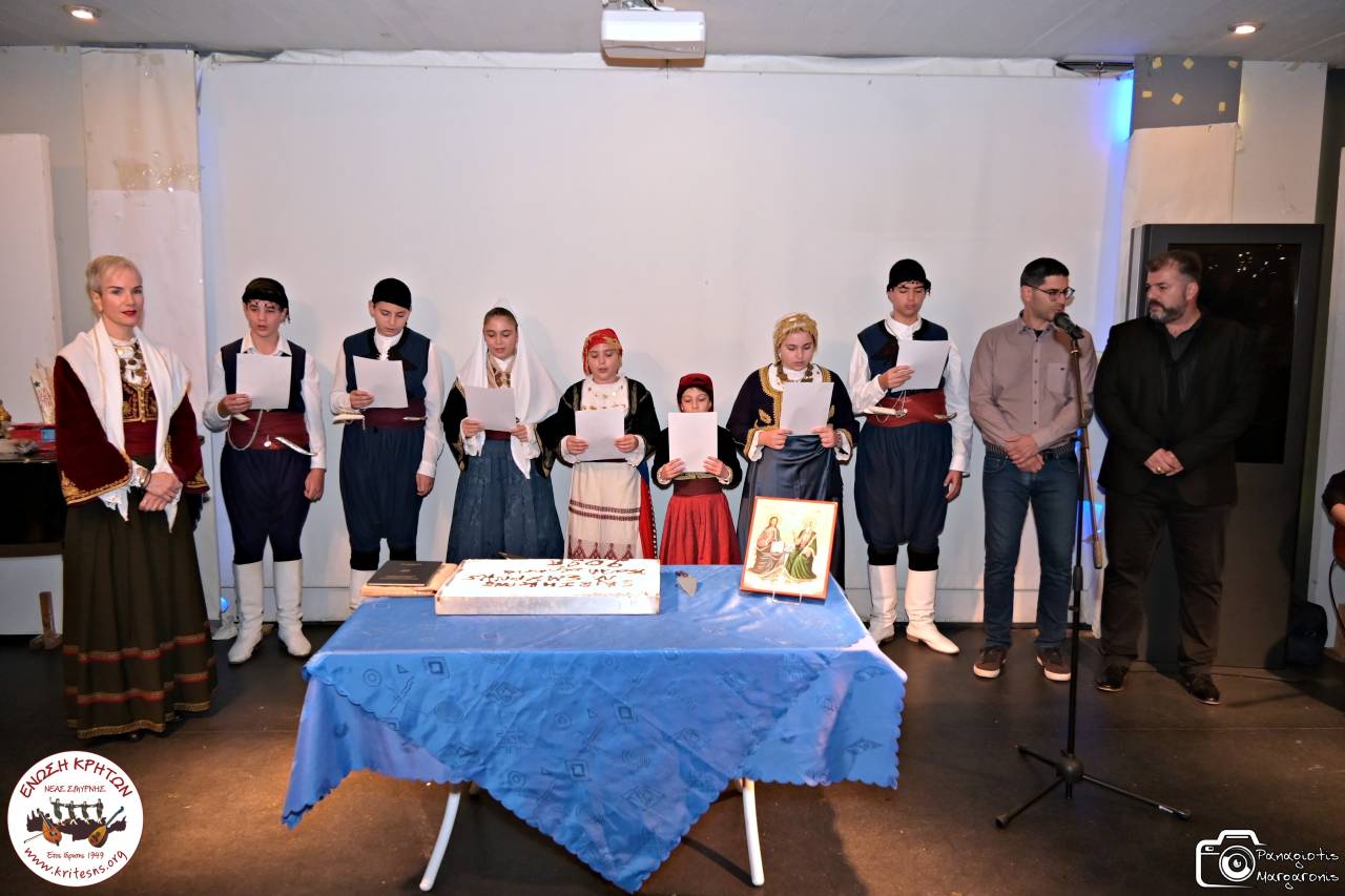 Η εκδήλωση άνοιξε με τα κρητικά πρωτοχρονιάτικα κάλαντα από την παιδική χορευτική ομάδα της Ένωσης, ενώ στη συνέχεια ο πατέρας Εμμανουήλ ευλόγησε τη Βασιλόπιτά μας.