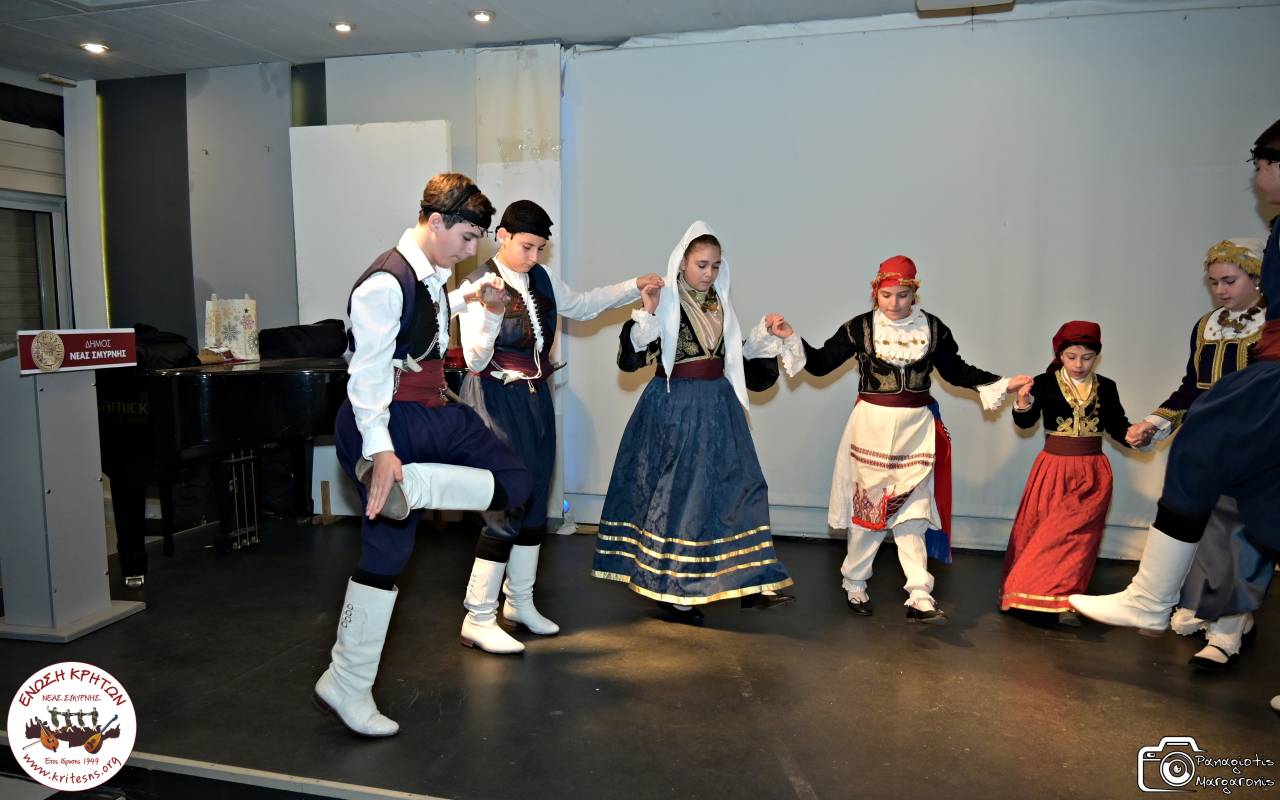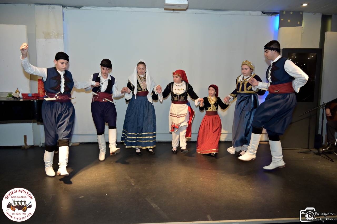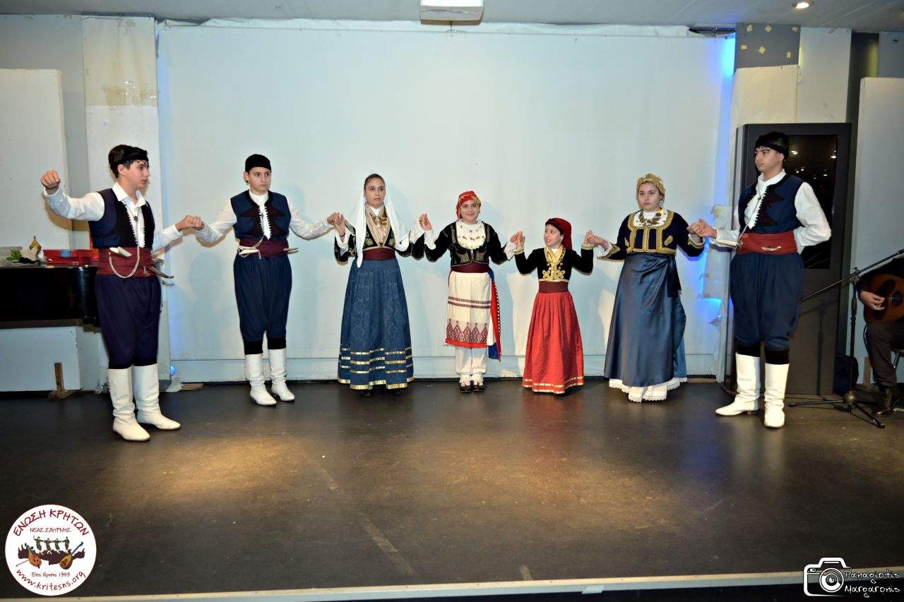 Η κατάμεστη αίθουσα, γεμάτη από φίλους και μέλη της Ένωσης, ενθουσιάστηκε με τους χορούς της παιδικής χορευτικής ομάδας, υπό τους ήχους του μουσικού σχήματος του δασκάλου της κρητικής λύρας της Ένωσης, Αντώνη Κεχαγιαδάκη, με τη συνοδεία των λαουτιέρηδων Αδαμάντιου Λαδουκάκη και Μανώλη Φετοκάκη.