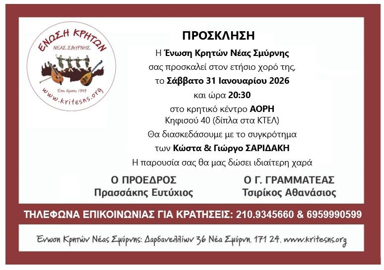 Πρόσκληση των μελών της Ένωσης Κρητών Νέας Σμύρνης σε ετήσια απολογιστική Γενική Συνέλευση